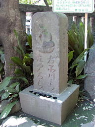 奥沢神社の入口、大蛇の姿をしたしめ縄が下がる鳥居の足下に、「右品川ミち」「左めくろミち」と書かれた道標が建っている。品川道の呼称が確認できる古い史料で、天明六年(1786)の銘がある。