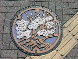 西武多摩川線多磨駅前には、白梅をデザインしたカラーマンホールがちりばめられている。あのかぐわしい芳香が楽しめないのは残念だけれど…。