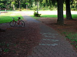 野川公園南端のテニスコートの横から北へ東八道路・一之橋バス停近くの入口まで、大芝生を横切って進む散歩道の石畳には、このほかにも「いか」「すし」「かた」などの言葉がちりばめられている。どうやら二文字言葉のしりとりになっているらしい。