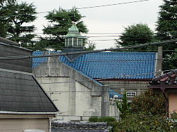 以前に紹介した「サイクリングロードの謎の山」付近の住宅地のすき間から、何となくイイ感じの塔を載せた古い建物が見える。大正12年(1923)に建てられた砧下浄水所の送水ポンプ所だ。