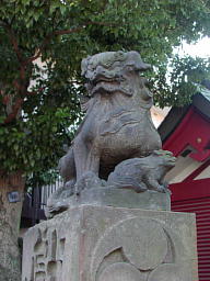 奥へ進むと明治四十四年(1911)に奉納された子連れの狛犬が睨みを利かせていた。細身の体に眼光鋭く、牙も爪もしっかりと刻まれている。ほかで見ることの多いユーモラスな獅子舞型ではなく、爬虫類的な、オオトカゲか小形の恐竜のような狛犬だった。