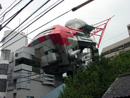 ビルともオブジェともつかない不思議な建物は、古い住宅や雑居ビルにごちゃごちゃと囲まれて窮屈そうだ。地上5階建てと言うから身長18mのガンダムと同じぐらいか。ビルの谷間からのぞく姿に、なるほど、実際に巨大ロボットが街に現れたらこんなふうに見えるのかもと妙に納得する。周りに何もない公園で見た姿よりずっとリアル感がある。