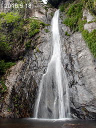 不思議な滝だ。どうどうと勢いよく落ちる音も、ざわざわと岩を咬む音もしない。誰もいない静けさの中に佇んで滝の落ちる景色を眺めていると、自分がそこにいることを忘れるようだ。途中に見てきた小天狗滝(右写真)の、ごくごく普通な感じとは対照的だ。