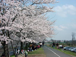土手の上は混雑していて自転車では走りにくいけれど、人が動いている分、堰の周辺よりは穏やかな雰囲気だ。座っている人たちも、少人数で静かに花を楽しんでいる。