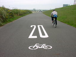 荒川の河川敷は写真のとおり制限時速20Km。この広さで20Km制限なら、この半分の幅もない多摩サイは何キロで走ればいいのだろう。