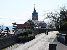 ロープウェイの山麓駅から函館山の山裾を巻くように伸びる石畳の道は、気持ちのイイ散歩道だ。有名、無名を取り混ぜてたくさんの洋館や洋館風の建物が並ぶ中で、この尖塔はひときわ目立って旅の雰囲気を盛り立ててくれる。