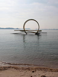 生口港に設置された「ベルベデール せとだ」(川上喜三郎、1996)は、瀬戸田のレモンをイメージした鮮やかなレモンイエローの輪が印象的な作品だ。二重の輪の間にある水平のスペースは、水遊びをする子供たちの飛込み台になったり、イベントのステージとなって観客を集めたりすることもできる。