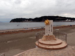 大きな碑には「太陽の季節ここに始まる 石原慎太郎」と書かれ、裏面に「彫塑は岡本太郎作 若い太陽」と説明がある。平成17年(2005)に、石原慎太郎の小説「太陽の季節」の芥川賞授賞50年を記念して建てられたのだそうだ。