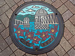 二つの取水塔が並ぶ多摩湖の風景は、多摩地区の数ある名所の中でもフォトジェニックなことでは上位を争うこと間違いなし。ガイドブックなどにも数多く採用されている。その景色を絵葉書風にアレンジした東大和市のカラーマンホールも、素敵な出来栄えになっている。