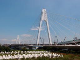 今まで何の疑いもなく両岸に二本の主塔をもつ一本の橋だと思っていたのだが、実際は、上下線が別の橋に分かれている。主塔一本の斜張橋と箱桁橋を組み合わせた橋が左右対称に配置されたデザインは、吊橋のような外見の吊弦材カンティレバートラス(ゲルバー式トラス)橋だった旧大師橋のイメージを継承しているそうだ。