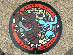 やじろべえのようなヤジロンは鳥かと思ったが、よく見れば遮光器土偶に似ている。ドーミラーは銅鏡だろうか。進化するとドータクン(銅鐸?)になる。マンホールの中央に、まさにこのために生まれましたとでも言いたげにぴったり収まっている。
