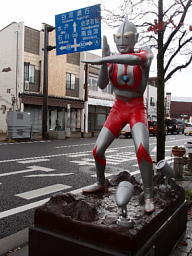 須賀川駅から町の中心部に向かう松明通りを歩いていく。釈迦堂川を渡ってすぐ、ウルトラマンタロウに出会った。100mも行かないうちに道の反対側に現れたのはウルトラマンエース。心は一気に子供時代に戻った。