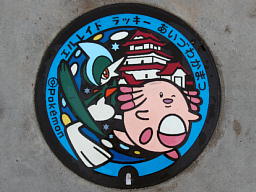 会津若松のポケふたは、やいばポケモン・エルレイドとふくしま応援ポケモンのラッキー。バックには鶴ヶ城がデザインされている。