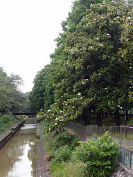 そんななかに、たくさんの花をつけた二本のタイサンボクを見つけた。そのうちの一本は、大きく伸びた枝を善福寺川に向かって張出している。おかげで、いつも見上げていた花をすぐ目の前に見ることができた。