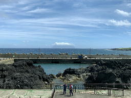 桟橋の横のスペースが、岩礁を囲んだプールのようになっている。これはクラマ根と呼ばれる岩礁地帯で、港ができる前は三池浜から見る景色が良かったのだという。工事で無くなるのを惜しんで保存しているのだそうだ。
