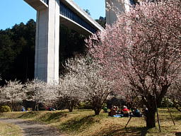 道路橋の足元には公園が作られ、紅白の梅がきれいに花を咲かせていた。年配のハイカーたちが思い思いに弁当を使いながら観梅を楽しんでいる。最寄りの駅からのんびりと歩いてきた人たちだ。その頭上をたくさんの車が素通りしていく。