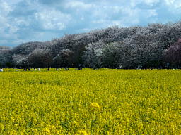 トンネルになった堤の桜並木を歩く人。菜の花畑を逍遙する人。桜の下に座り込んでくつろぐ人。人込みを避けて御幸湖畔にたたずむ人。様々な楽しみ方ができる公園で、誰が何をしていても気にならないぐらい広い。桜堤は約1km、菜の花畑はおよそ50,000m2もあるそうだ。
