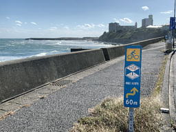ひたちなか市と大洗町を結ぶ海岸線にサイクリングロードが整備されている。ほとんどは歩道兼用で車道の端にガイドがついているだけのところもあるけれど、専用道路の建設も徐々に進んでいてこの先が楽しみだ。でも、ルート案内が全部英語表記なのはなぜなのかな?
