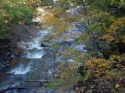 道路わきの崖の上から渓谷を見下ろす展望台からの景色は、木の葉に遮られて流れがよく見えない。それが秋になれば紅葉した葉の陰からのぞく渓流の景色となってちょうど良いはずなのだが、それが見られるのはもう少し先になるだろう。