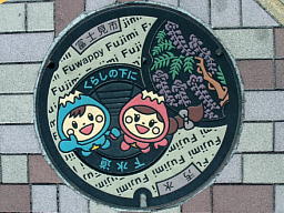 マンホールは市の花「フジ(藤)」をアレンジした従来型のマンホールも半分描かれているというユニークなデザインになっている。そのフジのカラーマンホールもすぐ近くに設置されていた。