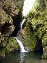 滝壺の周りは洞窟のようになっていて、その狭い感じが心地よい。広い空の下もいいけれど、こういう感じも悪くないかな。こけむした岩肌の柔らかな感じ、あたりに満ちているマイナスイオン、庇となってぎらぎらとした陽の光を遮ってくれる岩と森の木々、ほどよい広さと深さのある滝壺。