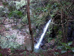 かぼそい踏み跡を探しながら降りていくと、深く切れ込んだ谷を見下ろす尾根の上の十字路に行き当たった。右は滝の上へ、左はたぶん多摩川に降りる道だろう。ここを直進して、尾根の端からUターンするように谷へ降りていく。何とか谷底にたどり着いたが、振り向くと、もうどこから来たのか道がはっきりしない。滝の周りは高い岩壁に囲まれた広場になっていて、遙か上に橋桁が見える。なんだか取り残された気分だ。