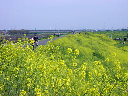 土手が菜の花で真っ黄色に染まっている。何でも大きくて広い荒川は土手も大きいし、そこに咲く菜の花の数もハンパない。