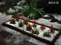 ※ 5月18日正午過ぎにも降雹がありました。写真はわが家の庭に降り積もった雹の様子。ほんの30分ほどの間のスペクタクルでした。