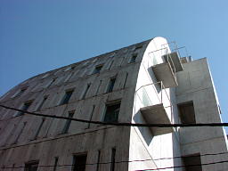 青山通り(246号線)から一歩中に入った住宅街に建つこのビルは、まん丸いおなかを突き出したユーモラスな姿が目を惹く。メタボではあるけれど、幅の異なる縦長の窓が織りなす模様がクリムトの絵に描かれた着物のテクスチャのようにも見えて、ちょっとかっこいいかも。