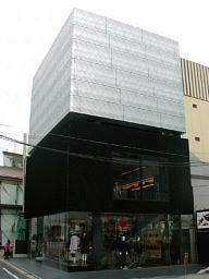 この建物を見た時の最初の印象は、そんな高級なお菓子の化粧箱。一階はプラスチックのクリアパッケージ、二階は緩衝材を兼ねた片面段ボールの黒い紙箱、粉砂糖をまぶしたような三階は和紙で包んだようにも見える。