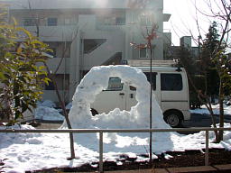 近くの住宅の駐車場には、カマクラが溶けて出来たと思われる雪のリングが残っていた。前に止まっている車は、このオブジェに日が当たらないように守っているように見えたけど、…たまたまだよね。
