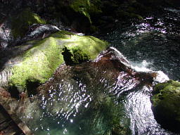 向かって右側の岩場を横切り、滝の上に架けられた橋を渡る。深い谷にはなかなか陽の光が届かないけれど、ちょうど橋を渡る時に、足もとの水面に陽が射してキラキラと輝く景色を見ることができた。