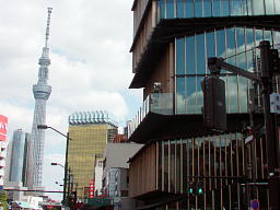イタズラ好きの大入道が浅草の町に現れて、そこらにあった町家をヒョイヒョイとつまみ上げては積み重ねていった。そんな感じの建物が雷門の前に建っている。隈研吾の設計で昨年(2012)オープンした浅草文化観光センターだ。