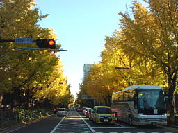 陽当たりのいい日本大通に対して直角に位置する山下公園通りでは、ビルの隙間から射す陽と陰の部分がまだらになって面白いコントラストをなしている。キラキラと輝くあちらとは対照的に、秋の日の憂愁みたいな感じがあって、これもまた味わいある情景だ。