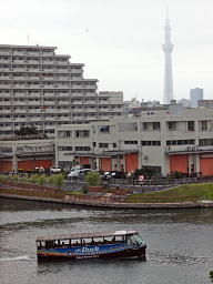 去年(2013)の春から運行を開始したスカイダックは、東京スカイツリーの足元を出発して(※)小名木川と旧中川の合流地点にある旧中川・川の駅までバスとして陸路を走ってくる。船の下にタイヤを付けた格好なので車高が高く、しかも船の甲板に座席を並べたような形なので、二階建てのオープンバスのような感じらしい。