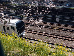 JR中央線の、駅から下り方面の北側斜面に菜の花と桜がきれいに咲いている。今がちょうど盛りで、鉄道ファンでなくても必見の眺めだ。