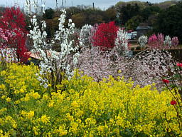 駐車場のまわりを彩る菜の花と桃の花が今真っ盛り。小さなしだれ桜も混じって、赤白黄色に薄いピンクと華やかだ。