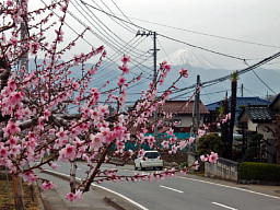 さすがは山梨県。曇り空でも富士山が見える。雲と雪山、白と白で写真には撮りにくいけれど、いい眺めだ。道の両側はピンクの桃畑。上り坂の先には乙ケ妻のしだれ桜が遠目にもはっきりと見える。
