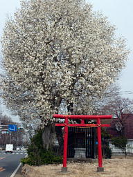 川越へしだれ桜を見に行く途中に、大きなコブシの木を見つけて急ブレーキをかけた。赤い鳥居が建っているけれど、その先の祠は小さく名前もあるのか無いのかはっきりしない。農家の方が豊作を願って畑の隅に建てたのだろう。春を迎え、今年の豊作を占うかのような満開の咲きっぷりが見事だ。