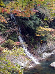 布滝は岩壁の上から一反木綿を垂らしたように静かに落ちている。落ち口は木に隠れて見えないが、その木々が色づいてイイ感じ。少し無理をして正面にまわれば全容が見えるのかも知れないが、隠れているものを無理に見ようとするのは野暮というもの、と次に進む。