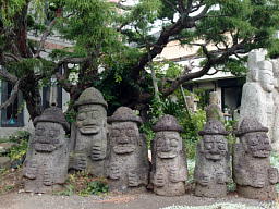 彼らは韓国・済州島(チェジュド)発祥の石像、トルハルバン(石のおじいさん)だ。家の前や集落の入口に、厄災の侵入を阻む塞の神として祀るものらしい。