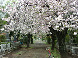 園内を埋めつくしていたソメイヨシノが散って、今はサトザクラがきれいに咲いている。特に固まって見られるのは、小金井門から入った通り沿いと、そこから菊池寛の墓所を右に折れた辺り。今日は三味線を持ち出して、唄の練習を兼ねた花見をしているグループがあった。