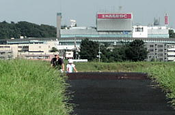 多摩川の土手を走っていくと、狛江市から世田谷区に入ったところから二子玉川の手前まで短い区間だが舗装されたサイクリング道路を走ることができるのだが、その途中に何とも不思議な山が二つある。対向車が見えないぐらいのしっかりした山で、横には土管らしきモノが立っている。狛江に近い方はただの土管に見えるが、二子玉川に近い方は左の写真の通り赤いトンガリ屋根を乗せていて何ともかわいい。