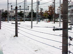 久しぶりにまとまった雪になったのは本当だが、電信柱が埋まるというのはウソ。左の写真は、訓練のため2mほどに低くしてある東京電力調布技能訓練所の電柱だ。