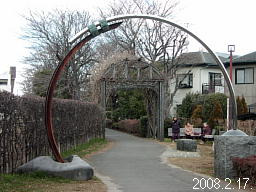 鉄道のレールを利用したゲートが迎えてくれる。中央線から北の部分は、戦時中に一式戦闘機“隼”などを作った立川飛行機・砂川工場に資材を運んだ引込線の跡地だそうだ。