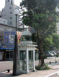 カモメの水兵さん・スカレーくんも、駅前でカレーの宣伝に活躍している。左の写真は三笠公園入り口に立つ灯台型の電話ボックスだが、奇しくも後ろに「海軍さんのカレー」のお店が写っていた。
